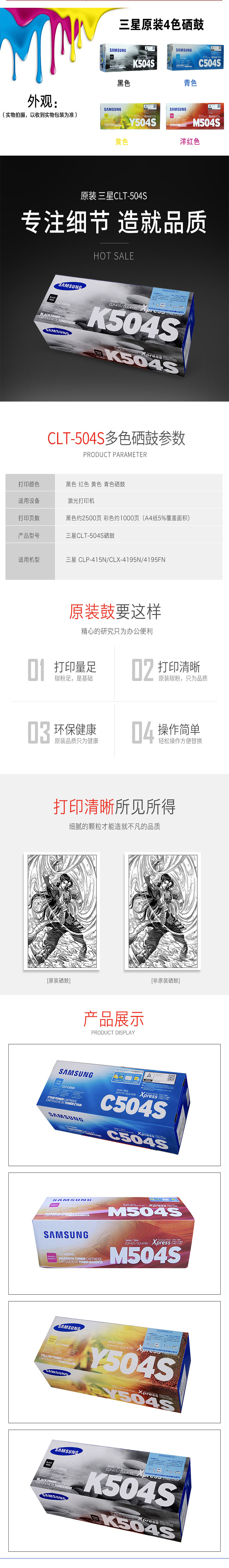颜色: 三星CLT-K504S【黑色】 三星CLT-M504S【红色】 三星CLT-Y504S【黄色】 三星CLT-C504S【青色】