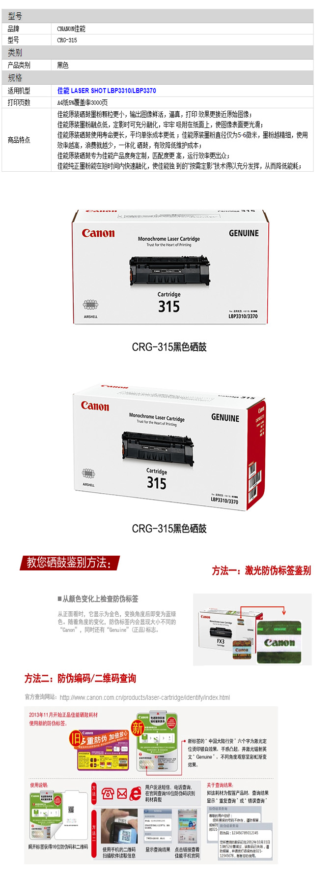 佳能CRG-315 原装黑色硒鼓 (适用:LBP3310 LBP3370)CRG 315