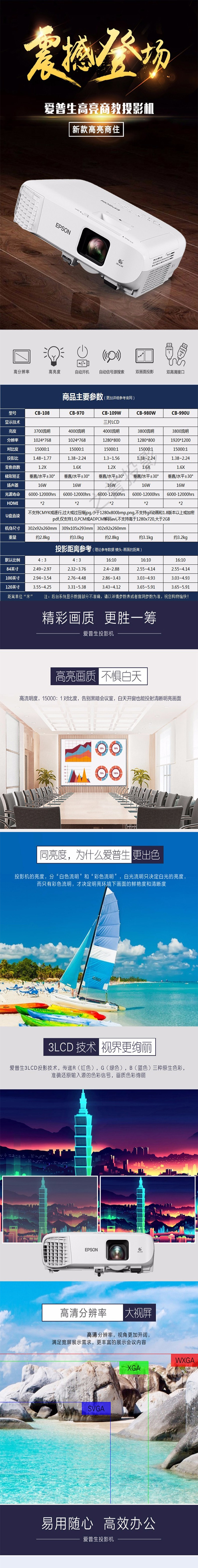 【爱普生CB-109W详细参数】主要参数 产品类型 商务投影机 投影技术 3LCD 显示芯片 3×0.59英寸芯片 亮度 4000流明 对比度 15000:1 标准分辨率 WXGA(1280*800) 光源参数 光源功率 230W 光源寿命 正常模式:6000小时,经济模式:12000小时 投影参数 变焦方式 手动变焦 聚焦方式 手动聚焦 变焦比 1.2X 光圈范围 F=1.49-1.72 实际焦距 f=16.9-20.28mm 投影距离 0.91-10.89m 投影尺寸 33-320英寸 屏幕比例 16:10 色彩数目 10.7亿色 梯形校正 垂直:-30-30度