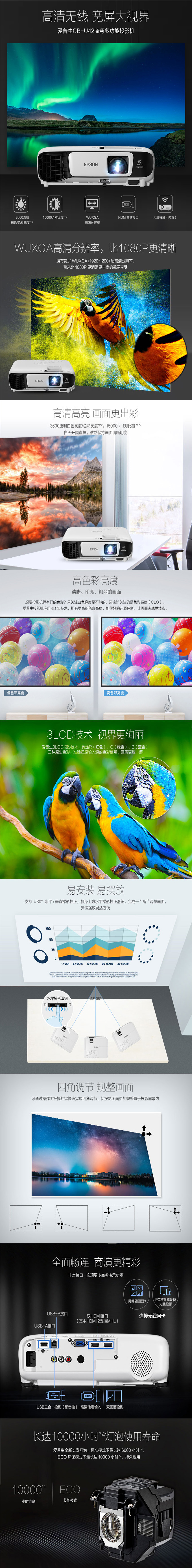 爱普生/Epson CB-U42 办公投影机 投影仪(3600流明 高清分辨率 双HDMI内置无线)
