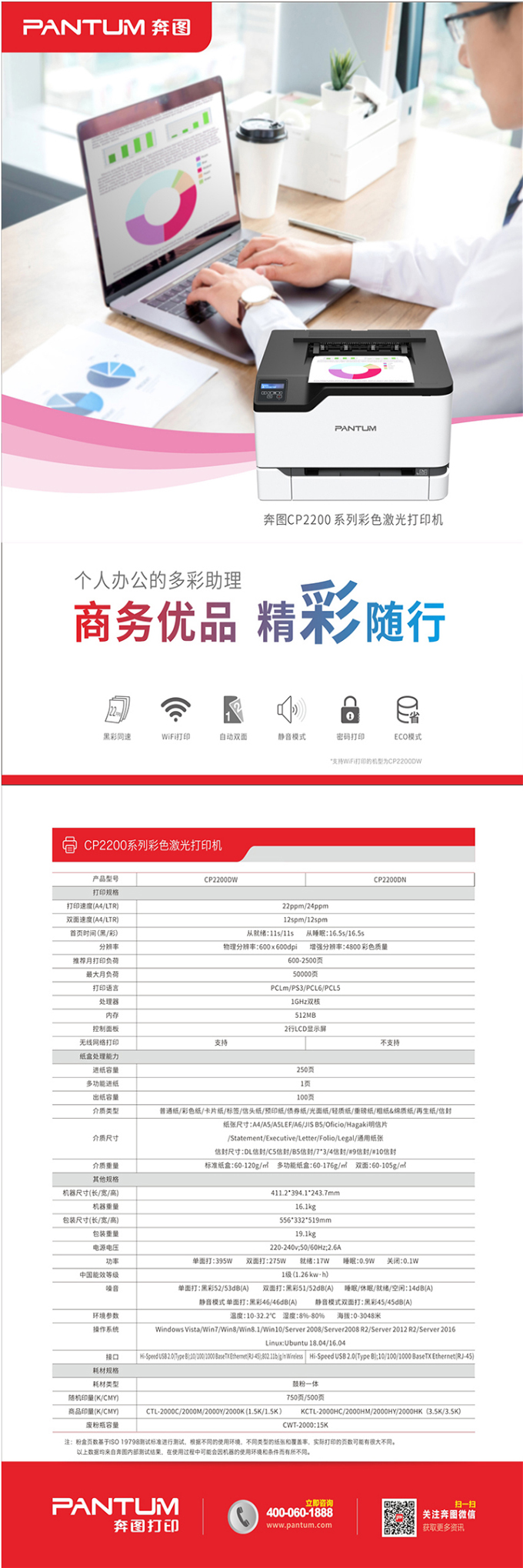 奔图/PANTUM CP2200DW彩色激光打印机 自动双面 无线多功能