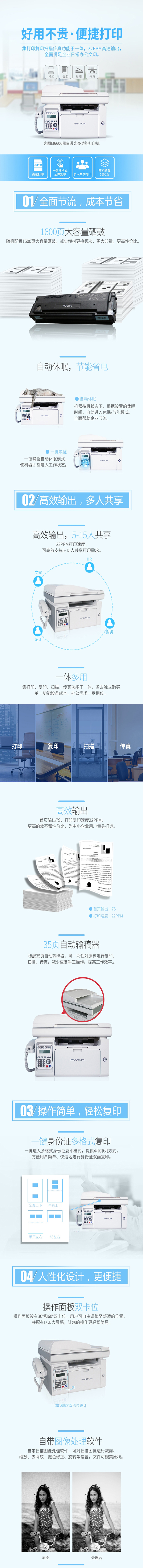 基础信息 产品定位 多功能商用一体机 产品类型 黑白激光多功能一体机 涵盖功能 打印/复印/扫描/传真 最大处理幅面 A4 耗材类型 鼓粉一体 双面功能 手动 网络功能 不支持网络打印 打印功能 黑白打印速度 22ppm 打印分辨率 1200×1200dpi 首页打印时间 <7秒 打印语言 GDI 月打印负荷 大致2万页 复印功能 复印速度 A4:22ppm,Letter:23ppm 复印分辨率 1200×1200dpi 首页复印时间 平板:<10秒,ADF:<12秒 连续复印 1-99页 N合1复印 支持N合1复印 缩放范围 25-400%(最小调整量为1%) 复印其它性能 支持身份证复印,票据复印,多合一复印,克隆复印 扫描功能 扫描控制器 标准配置 扫描类型 平板式 扫描速度 A4:22ppm,letter:23ppm 最大分辨率 平板:1200×1200dpi,ADF:600×600dpi 扫描尺寸 平板:216×297mm,ADF:216×356mm 扫描其它性能 扫描到PC 传真功能 传真控制器 标准配置 传真类型 黑白 调制解调器速度 33.6kbps 传真分辨率 300×300dpi PC-FAX PC-FAX发送和接收双向 传真内存 650页 编码方式 MH/MR/MMR 电话手柄 标配 传真其它性能 支持垃圾传真过滤,多址发送,传真转发,速拨号,组拨号,延迟发送,自动重拨,自动接收,自动缩小,移动传真 介质规格 介质类型 普通纸,厚纸,透明胶片,卡片纸,标签纸,信封,薄纸 介质尺寸 A4,A5,JIS B5,IS0 B5,A6,Letter,Legal,Executive,Folio,Oficio,Statement,Japanese Postcard,Monarch Env,DL Env,C5 Env,C6 Env,No.10 Env,ZL,Big 16K,Big 32K,16K,32K,B6 介质重量 60-163g/㎡ 供纸盒容量 标配:150页 输出容量 100页 其它参数 处理器 600MHz 内存 256MB 系统平台 Windows Server 2003/Server 2008/Server 2012/XP/Vista/7/8/8.1(32/64bit),Mac OS 10.6/10.7/10.8/10.9/10.10,Linux(Ubuntu 12.04与14.04),中标麒麟(龙芯) 接口类型 USB2.0 电源电压 AC 220-240V(-15%,+10%),50/60Hz(±2Hz),3A 耗电量 打印:370W,就绪:45W,待机:<4W 产品尺寸 417×305×301mm 产品重量 8.5kg(含硒鼓) 工作噪音 打印:52dB(A),待机:30dB(A) 环境参数 工作温度:10-32℃,工作湿度:20%-80% 附件 包装清单 主机 x1