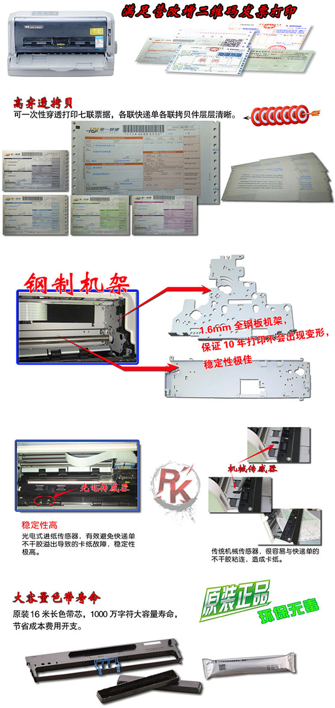 产品定位 平推票据打印机 产品类型 高效型24针82列税控发票打印机 打印方式 24针点阵击打式 打印头寿命 4亿次/针 字符集 GB18030 打印速度 430字/秒 复写能力 1+6 平均无故障时间 20000小时以上 色带框型号 80D-3 色带寿命 1000万字符 最 大进纸宽度 297mm 最 大打印厚度 0.58mm 接口 并行接口、USB接口 尺寸 404(宽)×322(长)×203(高)mm 重量 5Kg - 只有登录用户允许发表评论.