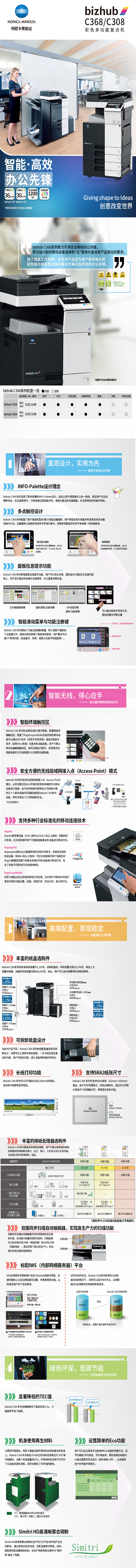 【柯尼卡美能达C308参数】基本参数 产品类型 数码复合机 颜色类型 彩色 涵盖功能 复印/打印/扫描 最大原稿尺寸 A3 内存容量 标配:2GB,最大:4GB 硬盘容量 250GB 供纸容量 标配纸盒:500页(2个),多功能手送纸盘:150页,最大容量:6650页(需选购) 介质重量 纸盒:52-256g/㎡,手送纸盘:60-300g/㎡ 双面器 标配