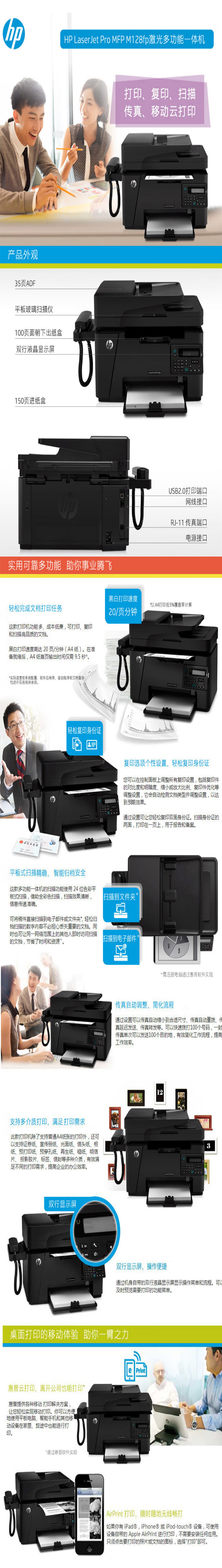 惠普/HP LaserJet Pro MFP M128fw黑白激光多功能一体机(打印 复印 扫描 传真)