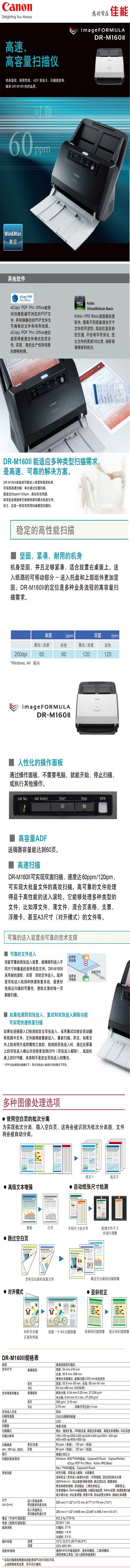 【佳能 DR-M160II 参数】基本参数 产品用途 商业运用 产品类型 馈纸式 最大幅面 A3 扫描元件 CMOS 光学分辨率 150×150dpi,200×200dpi,240×240dpi,300×300dpi,400×400dpi,600×600dpi 扫描介质 文件,票据,图片,照片,名片,卡片,证件 扫描速度 A4,200dpi,纵向:60ppm(单面),120ipm(双面) 接口类型 高速USB2.0 性能参数 扫描光源 LED 扫描模式 黑白,错误扩散,高速文本增强,高级文本增强II 色彩位数 24位 灰度参数 256级 送稿器容量 60页 介质尺寸 普通纸:宽度:54-216mm,长度:50.8-356mm(通过设置扫描仪为长纸模式,可以扫描长达3000mm的文件)