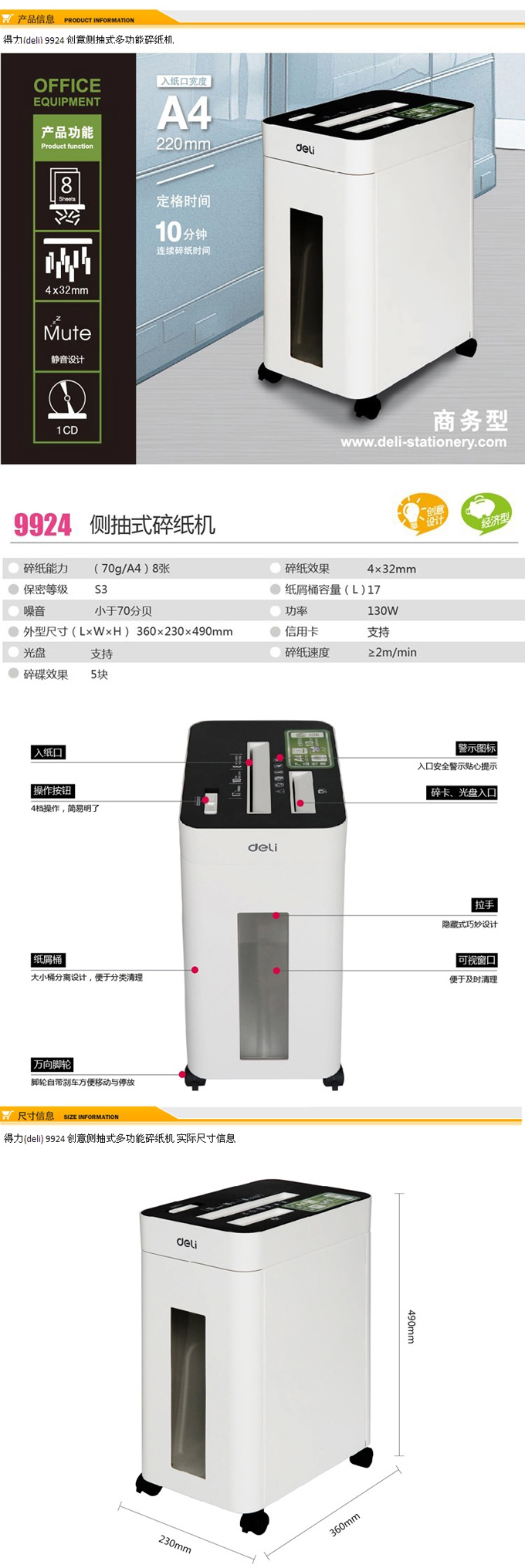 得力Deli 9924 侧抽式商务型碎纸机