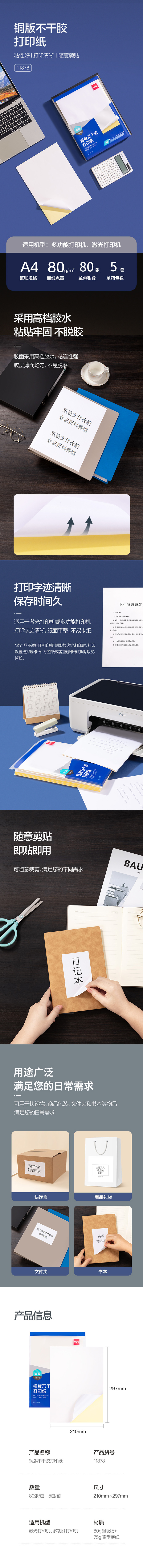 得力/Deli 11878 A4不干胶标贴打印纸 带背胶可粘贴标签纸 光面铜版纸 80张