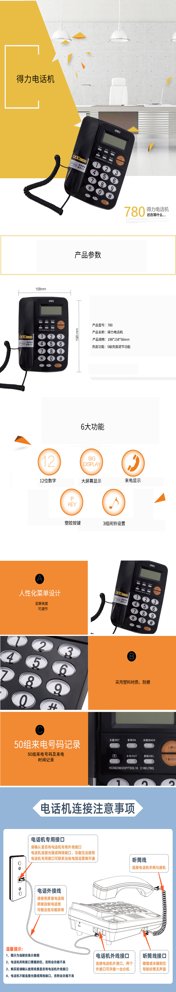 最小销售单位:台 包装数量:30 / 0 / 0 / 1 货号:780 物料描述:得力780电话机(黑)