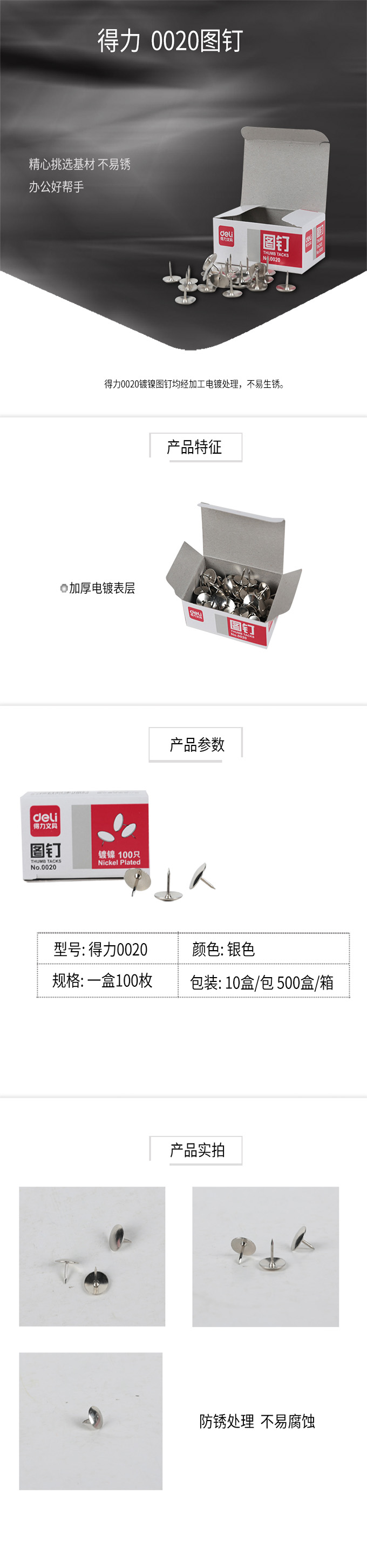 得力/deli 0020 图钉100粒/盒