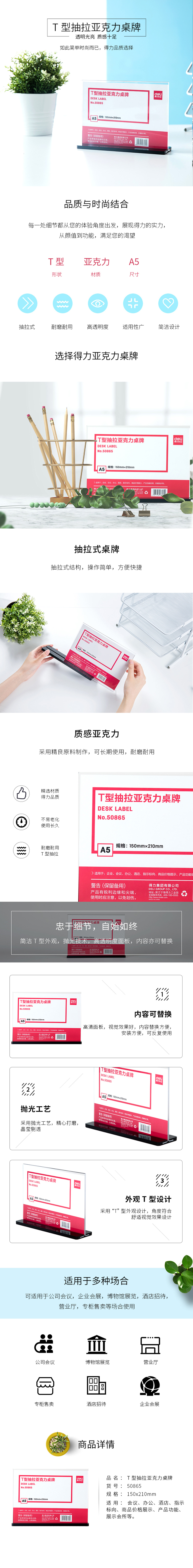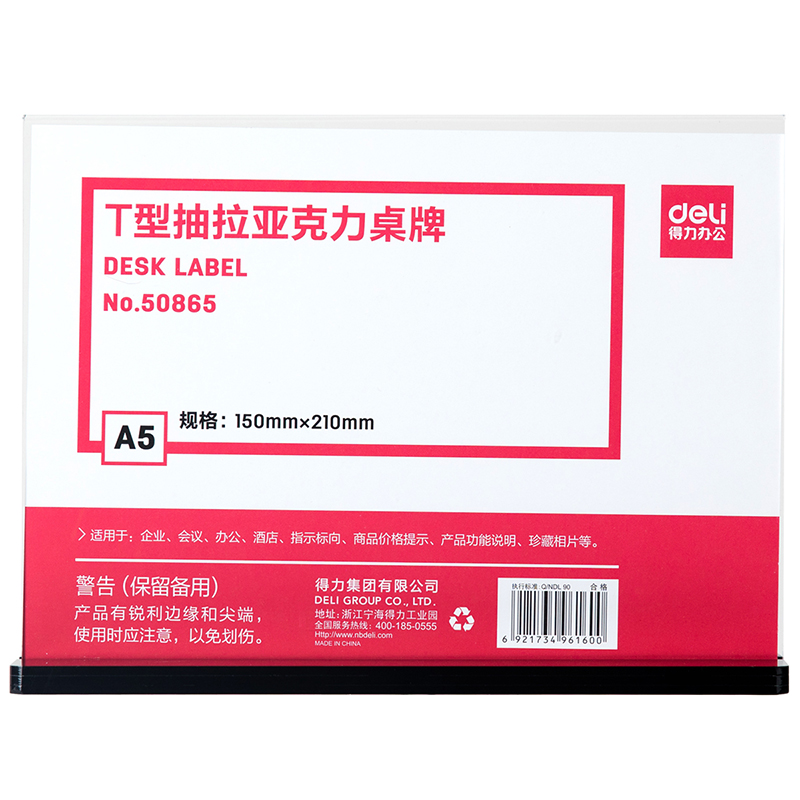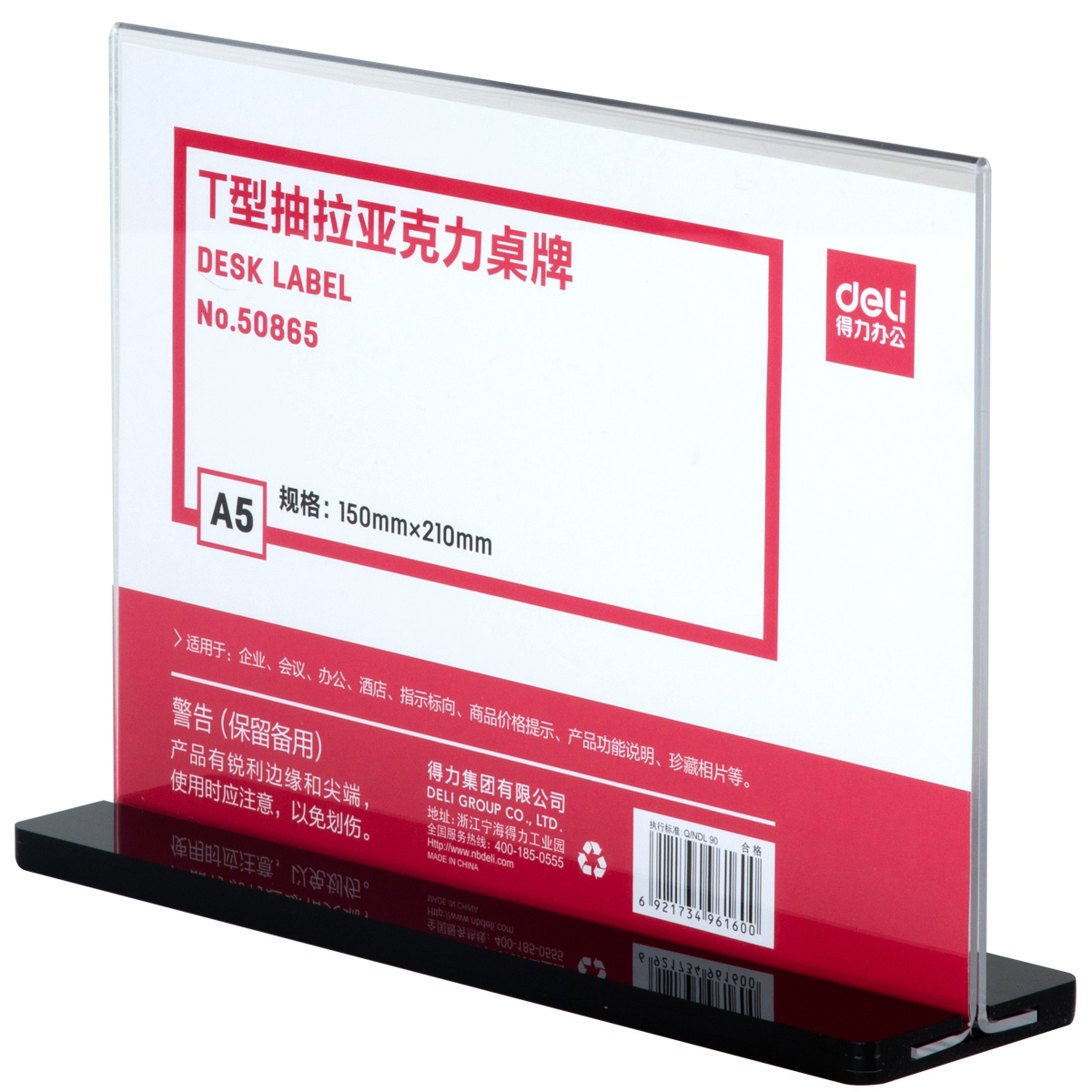 得力50865T型抽拉亚克力桌牌(横向 A5)210*150mm