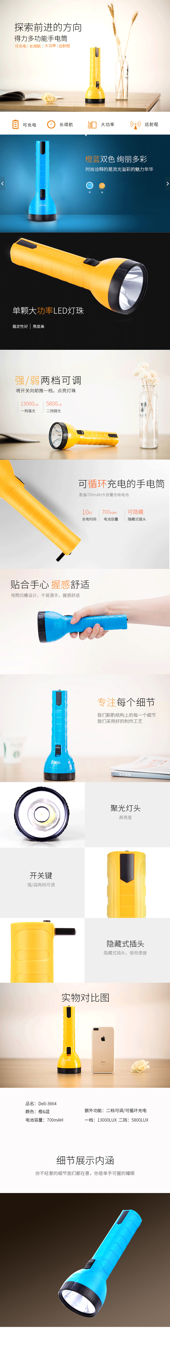 得力deli 3664 可循环充电型LED手电筒(中大型,25cm)