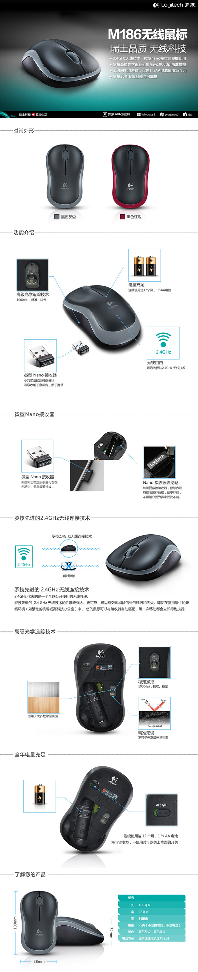 罗技高级光学追踪引擎带来1000dpi精准操控,2.4GHz无线技术,微型nano接收器即插即用;