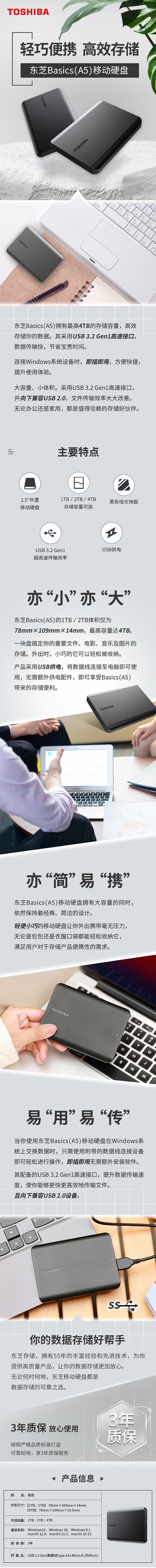 东芝(TOSHIBA)1TB/2TB 移动硬盘机械 新小黑A5 USB3.2 Gen 1 2.5英寸 兼容Mac 数据存储 轻薄便携