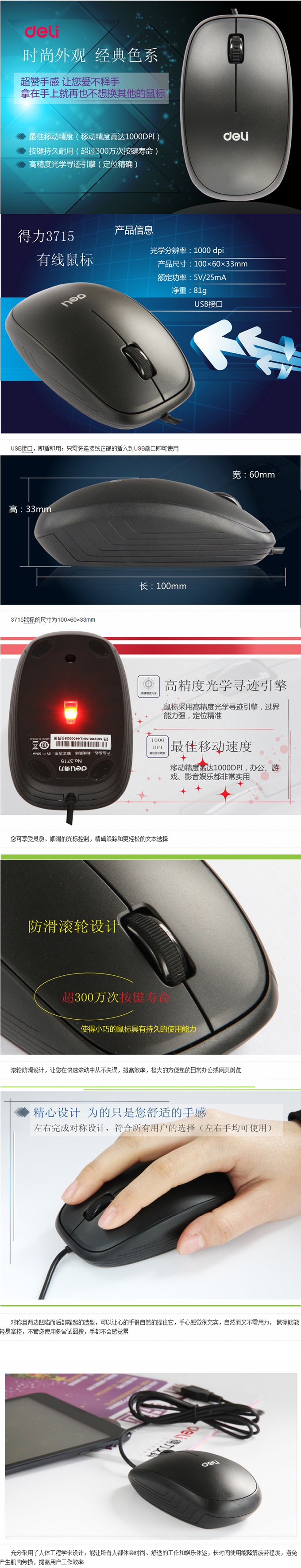 得力deli 3715 1000dpi 手感型有线鼠标 USB