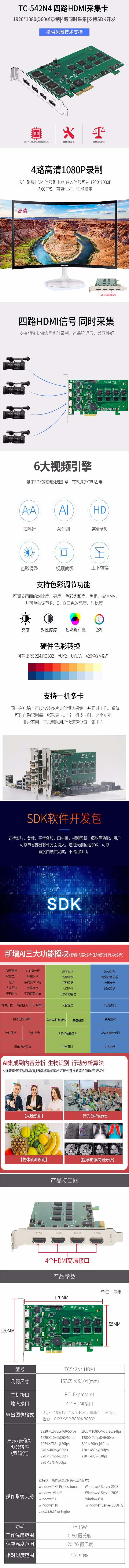 天创恒达TC 542N4 四路HDMI高清采集卡 支持4路同时采集、SDK开发