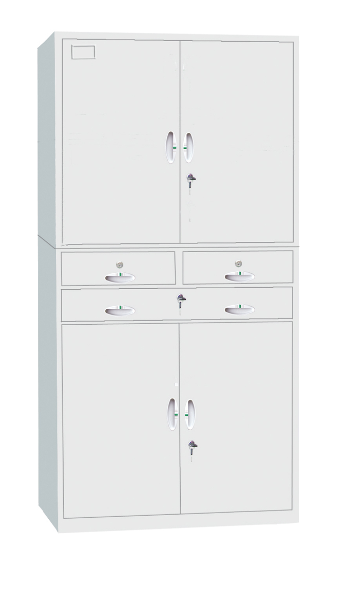 上面两节对开门为空,可放档案文件,下节内一可调式隔板,隔板可自由上下调节,增加充分利用柜体空间。