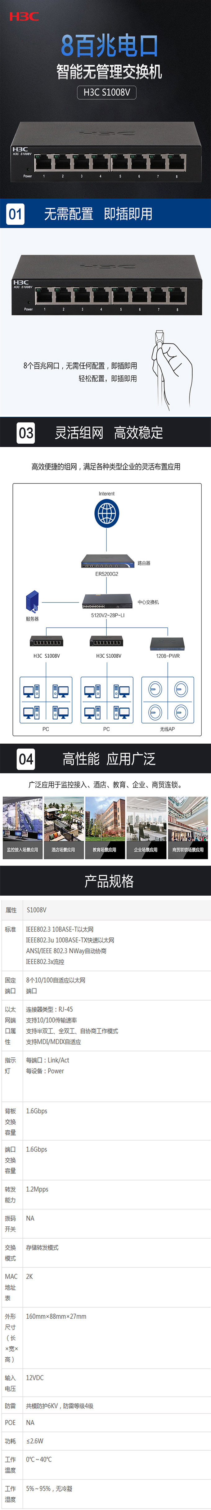华三/H3C S1008V 企业级交换机 8口百兆非网管监控网络交换机 即插即用