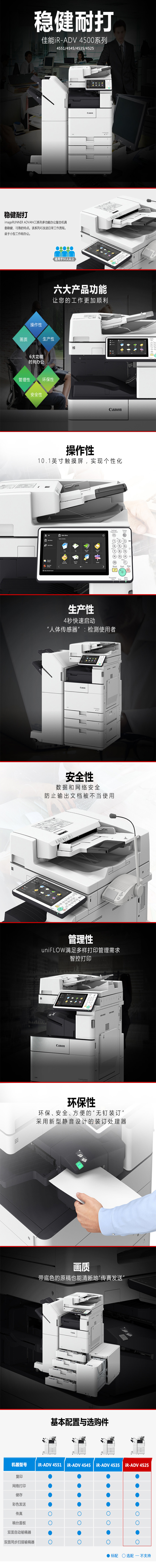 【佳能iR-ADV 4535参数】基本参数 产品类型 数码复合机 颜色类型 黑白 涵盖功能 复印/打印/扫描 速度类型 中速 最大原稿尺寸 A3 内存容量 标配:3GB 硬盘容量 标配:250GB ,选配:1TB 供纸容量 标配纸盒:550页(2个),手送纸盘:80页
