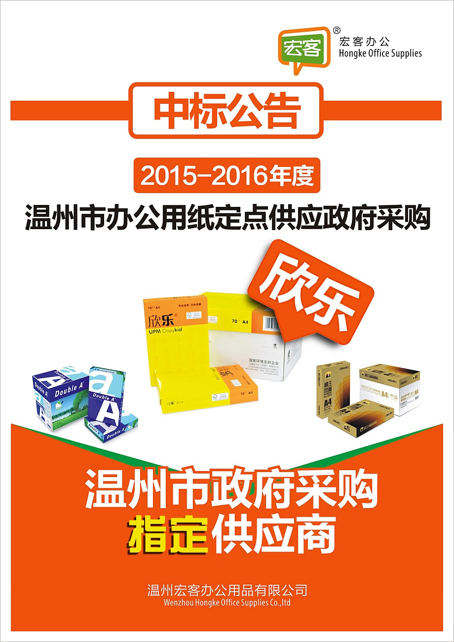 温州市行政审批与公共资源交易服务管理中心就2015-2016年度温州市办公用纸定点供应政府采购项目进行公开招标集中采购(项目编号:Z-GB201509120134),本项目于2015年10月20日发布采购公告,2015年11月11日进行评审,最后经评标委员会综合评定,确定此次中标人为(具体内容详见: