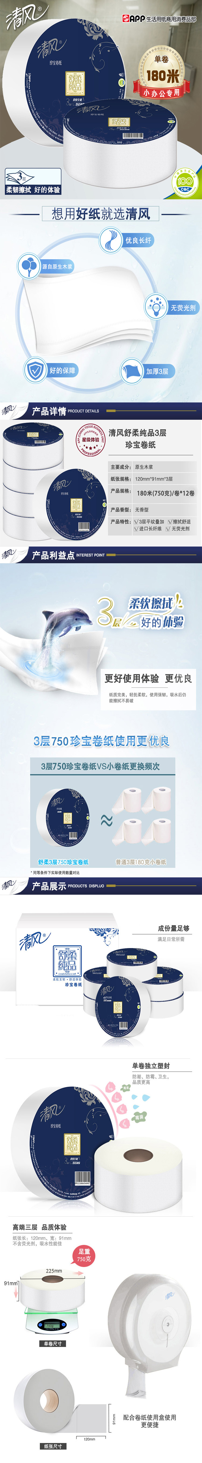 清风 大卷纸盘纸卫生纸巾 BJ00AB 商用珍宝纸3层180米12卷有芯卷筒纸整箱