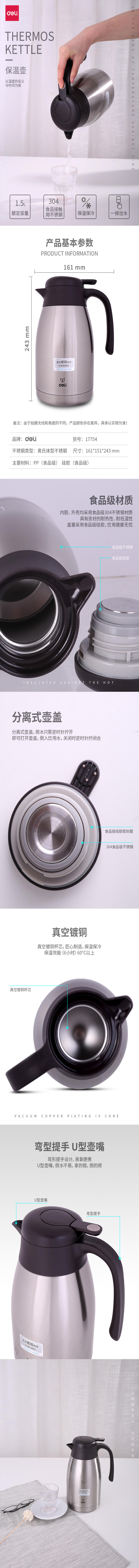 得力/deli 17754 不锈钢真空保温壶 家用暖水壶 1.5L